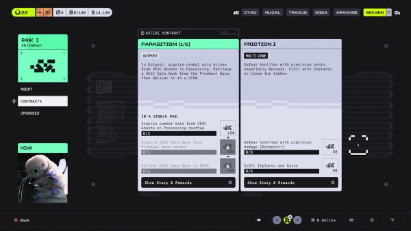 The moment to moment is like any other extraction Shooter. You choose a shell and load them up with what loot you want to use in the round. Or if you have “Gear-Fear”, choose a free load-out with bottom tier weapons and consumables. Then, and most importantly, you choose a faction mission or quest to do in the map… and away you go.